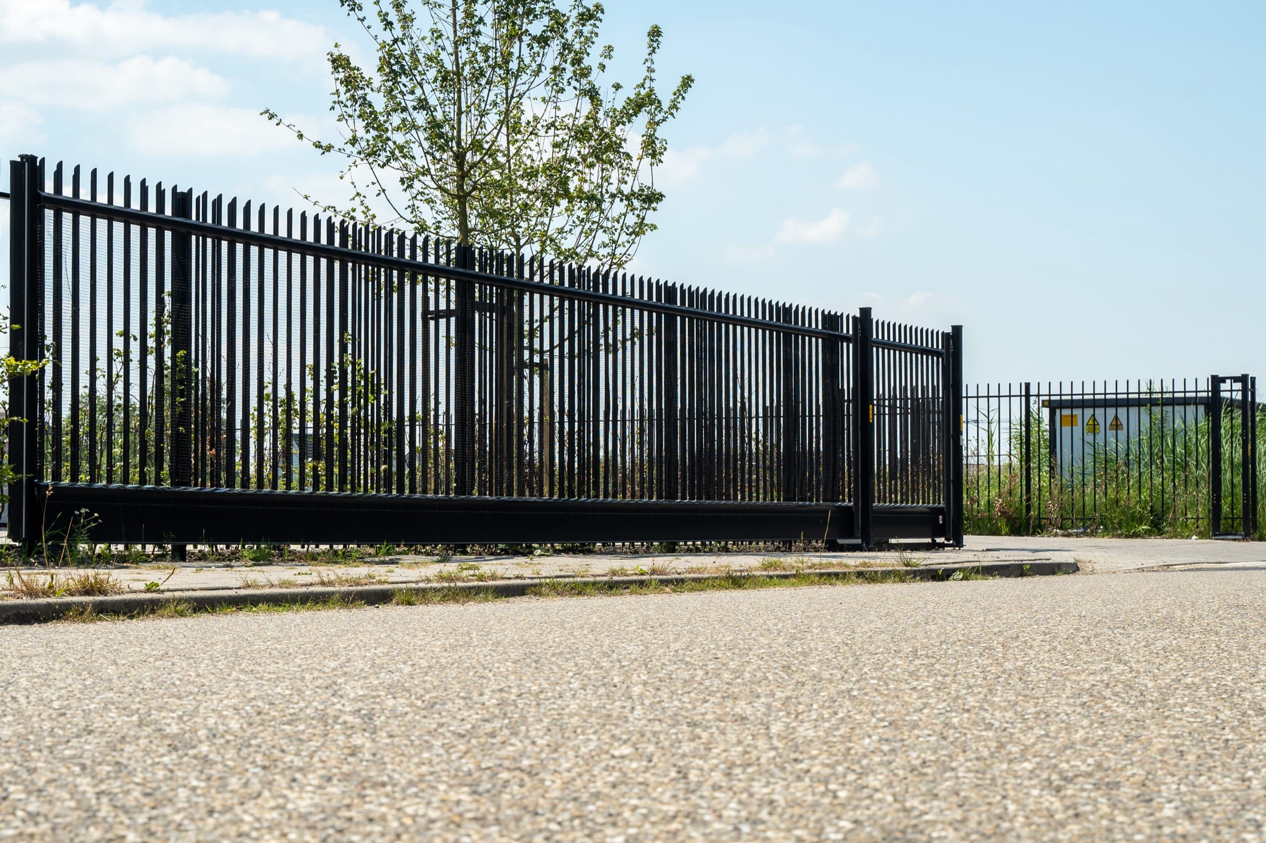 De toegang wordt geregeld via twee elektrische schuifpoorten van het type Eco-Liner, eveneens uitgevoerd in zwart en volledig afgestemd op het hekwerk. Met doorgangen van respectievelijk 6 en 10 meter vormen deze poorten een veilige en efficiënte toegang tot het terrein.